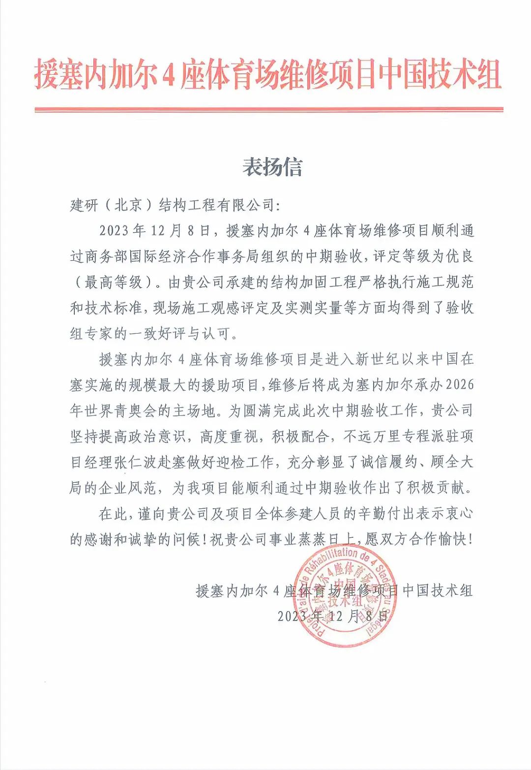 12月8日,援塞內加爾4座體育場維修項目順利通過商務部國際經濟合作事務局組織的中期驗收,評定等級為優良(最高等級)。援塞內加爾4座體育場維修項目中國技術組繼今年3月后再次向中建研科技所屬建研結構公司發來表揚信,充分肯定和表揚了公司項目管理團隊在該項目中作出的重要貢獻。