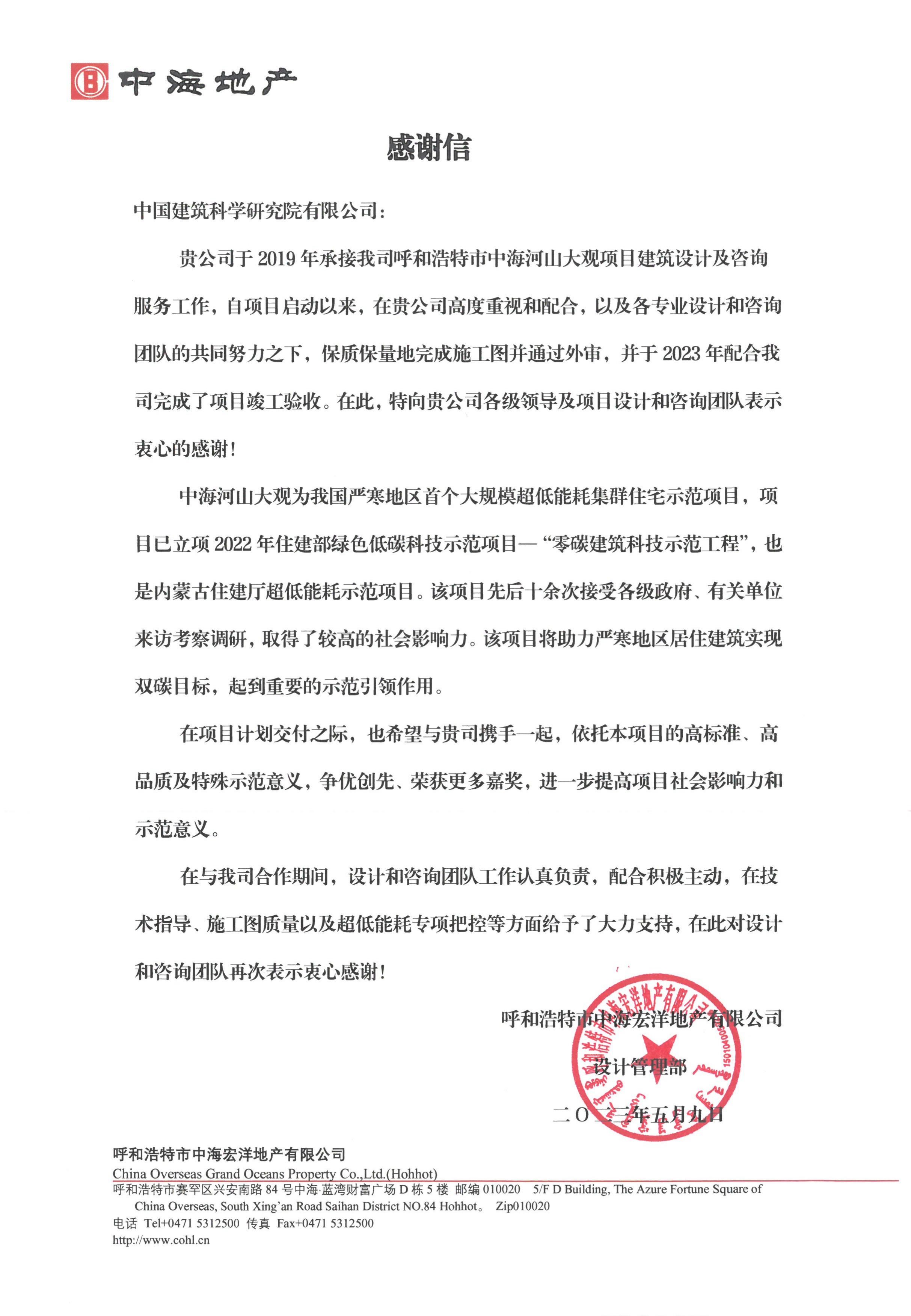 近期,中國建研院收到來自呼和浩特市中海宏洋地產(chǎn)有限公司的感謝信。信中表示,目前“呼和浩特市中海河山大觀項目”已經(jīng)順利完成了項目竣工驗收,對中國建研院在項目建設(shè)過程中提供的設(shè)計與咨詢服務(wù)以及團(tuán)隊的精湛技術(shù)表示感謝。