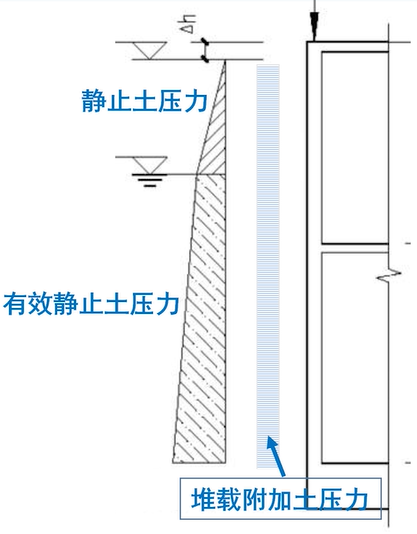 尚應(yīng)考慮地面堆載產(chǎn)生的附加土壓力,地面堆載應(yīng)按實(shí)際情況考慮,一般不小于5kN/㎡