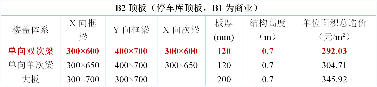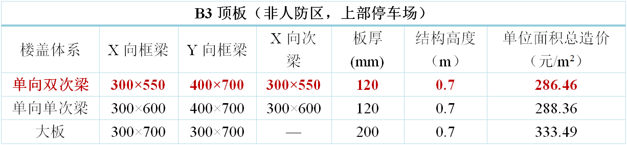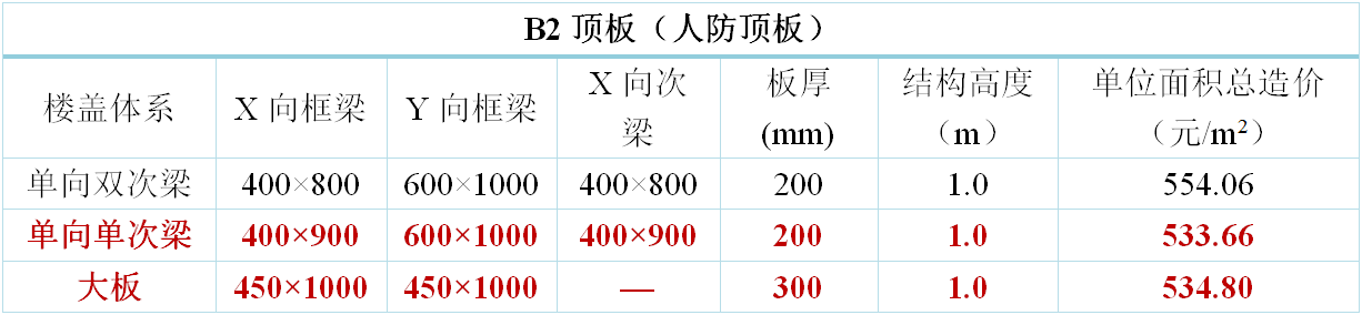 地下室樓蓋方案原則上考慮三種方案布置:主梁大板、單向單次梁、單向雙次梁。其中,地下室頂板增加考慮十字梁方案。