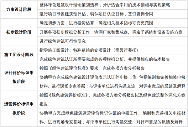 隨即開展的綠色建筑咨詢工作將與項目的設(shè)計工作進(jìn)程緊密結(jié)合。在方案設(shè)計階段將與業(yè)主展開廣泛交流以確定綠色建筑整體方案,如建筑冷熱源方案,可再生能源建筑利用方案等。在初步設(shè)計、擴(kuò)初設(shè)計及施工圖設(shè)計階段中,咨詢團(tuán)隊將與業(yè)主及設(shè)計單位緊密合作,以確保綠色建筑整體方案落到實處。