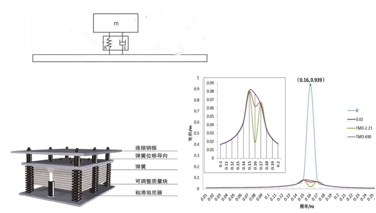 TMD減振方法是一種控制結(jié)構(gòu)振動響應(yīng)的減振措施。通過設(shè)置一個附加的單自由度減振體系,將原結(jié)構(gòu)的振動能量吸收到減振體系。附加振動體系中的阻尼器耗能,最終消耗原結(jié)構(gòu)的振動能量,大幅減小原結(jié)構(gòu)的振動反應(yīng),達(dá)到舒適度要求。