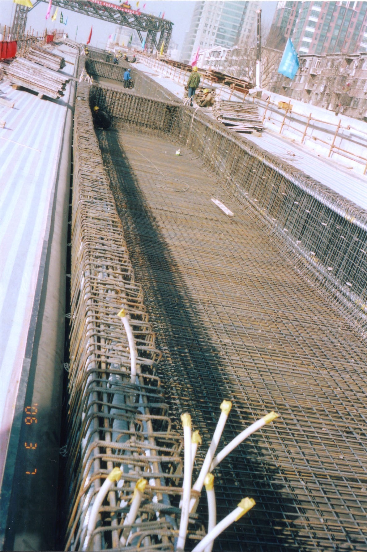 預(yù)應(yīng)力施工。預(yù)應(yīng)力T型簡支梁,跨度60m,國內(nèi)第一例雙幅面轉(zhuǎn)體施工的橋梁。